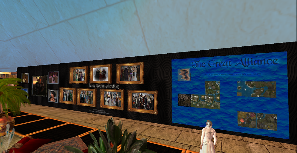 The name Great Alliance represent, mean, the all sims link one to each other under one queen, the Queen Comet: having the centre in Sylvhara Elen, the place of the castle of the Queen herself, we can find close to it the 3 little sisters, I mean, Sylvhara Tari, Sylvhara Anar and Sylvhara Isil; following, the dark sim Taure Ru, the more shining Sea's of Greenhaven links to the sim Whispering Pine, and the last 2, Vana and Lundene.